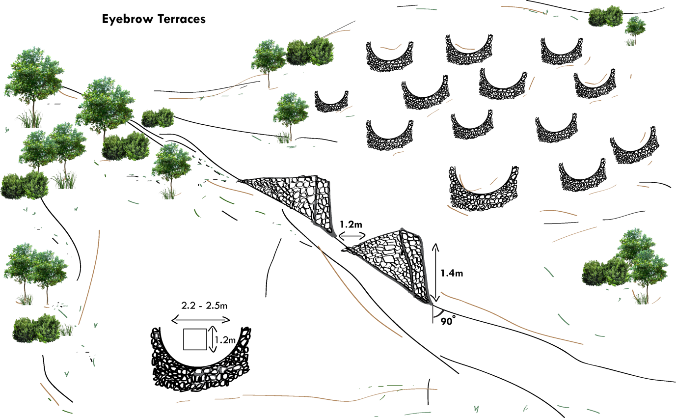 Some of the main advantages of Eyebrow Terraces are that they reduce the risk of flooding, while simultaneously increasing the on-site conversion of water through the facilitation of filtration. Furthermore, the intervention improves the yields in the area, by increasing the soil organic content, as sediments are trapped in the terraces.