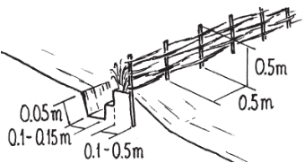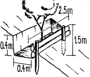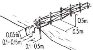 Wooden stakes with a diameter of 15-20 cm and 1.5m long are planted into the soil and then logs of approximately 2.5m in length should be nailed to these posts, as can be seen in the diagram.