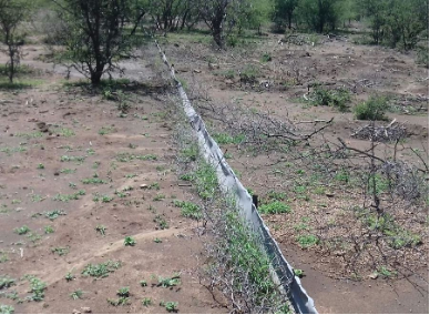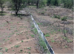Silt Fences, along with brush packing, have been introduced in the Potlake Nature Reserve, Limpopo Province, South Africa, to address sediment transport and restore areas suffering from gully erosion. The purpose of this technology is to rehabilitate land affected by rill and gully erosion, which is a result of overgrazing on highly erodible soils. The method involves the use of temporary Silt Fences placed closely together to trap sediment and reduce erosion. These fences are designed to last about ten years, during which time vegetation is expected to establish and stabilize the soil. Additional support is provided by brush packing upstream and stone packing downstream. The Potlake Nature Reserve spans altitudes from 1,174 to 780 meters above sea level and is located in a summer rainfall region with an annual average rainfall of 438 mm. The soil in the reserve is clayey and highly prone to erosion. The vegetation consists of Central Bushveld units within the Savanna Biome, characterized by a mix of grasses, shrubs, and trees. The reserve contains several large gullies, some up to 1.5 meters deep and 5 meters wide, which are targeted by erosion control measures. Approximately 200 meters of Silt Fences have been erected at selected sites within the reserve to retain sediment and establish vegetation. The project covers an area of about 1-10 km² and is evenly spread across the targeted sites. The Potlake Nature Reserve, where the technology has been implemented, is a permanently protected area. This erosion control technology was introduced less than ten years ago through external projects and interventions.